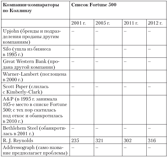 В своей книге Коллинз упоминает компании, которые он называет компараторами. Это компании, которые функционируют в одной отрасли и располагают одинаковыми возможностями для достижения великолепия, но по какой-то причине не смогли продемонстрировать тот рост, которого ожидал Коллинз. Когда мы смотрим на эти компании через десять лет после выхода книги, у нас возникают идеи, имеющие непосредственное отношение к обсуждению историй успеха. Давайте используем список Fortune 500 в качестве индикатора и рассмотрим список компаний-компараторов.