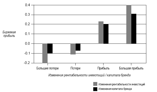 Исследователи в области финансов выявили тесную взаимосвязь между рентабельностью инвестиций и ценами на акции. В среднем если рентабельность повышается, то растет и цена акций. В обоих исследованиях мы обнаружили, что влияние возрастающего капитала бренда на биржевую прибыль было почти так же велико, как рентабельность инвестиций, – около 70 %. На рисунке 1 представлены результаты исследования EquiTrend. Рисунок наглядно показывает, что биржевая прибыль реагирует на большие потери или большой прирост капитала бренда почти так же, как на изменения рентабельности инвестиций. А вот реклама, наоборот, не имела никакого влияния на биржевую прибыль, она была зависима только от капитала бренда.