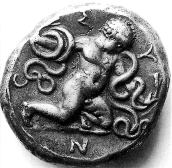 Геракл душит змей в колыбели. Монета, отчеканенная в честь союза со Спартой. Геракл символизирует Спарту, а змеи — афинскую демократию