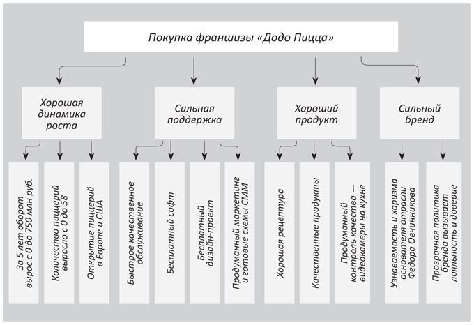 В случае с покупкой франшизы мы можем зацепиться за то, что нам понятно или наиболее важно. Начнем с оборота компании или с того, что нам нравится Федор Овчинников (основатель «Додо Пиццы»), а затем соберем недостающую информацию и заполним все части пирамиды.
