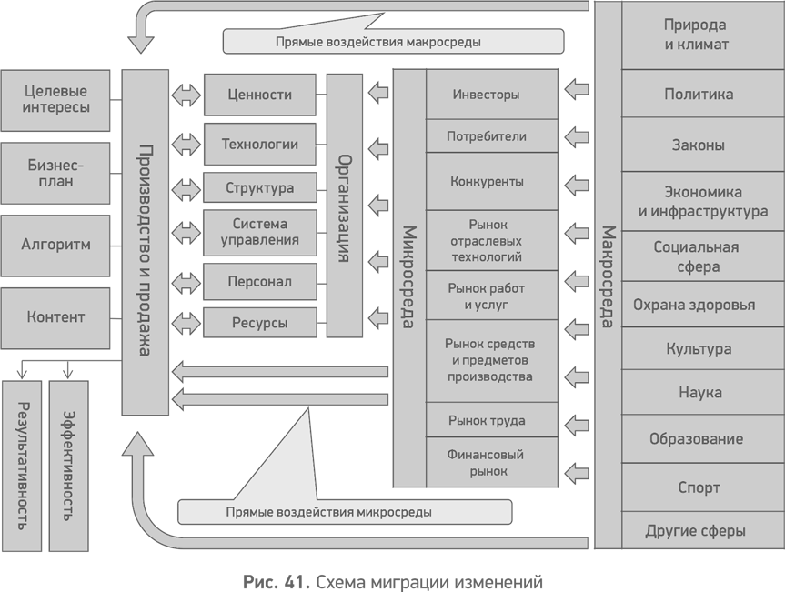 Почему такие воздействия называются опосредованными? Потому что они вызывают последовательные умеренные изменения по «принципу домино». Если умеренные изменения происходят в макросреде, сначала они воздействуют на микросреду, вызывая там аналогичные изменения. Затем на функциональную модель организации, после чего – на производство и продажу. Если же умеренные изменения происходят в микросреде организации, тогда их воздействия начинаются с функциональной модели и затем распространяются на производство и продажу. Опосредованные воздействия показаны на рис. 41 короткими стрелками.