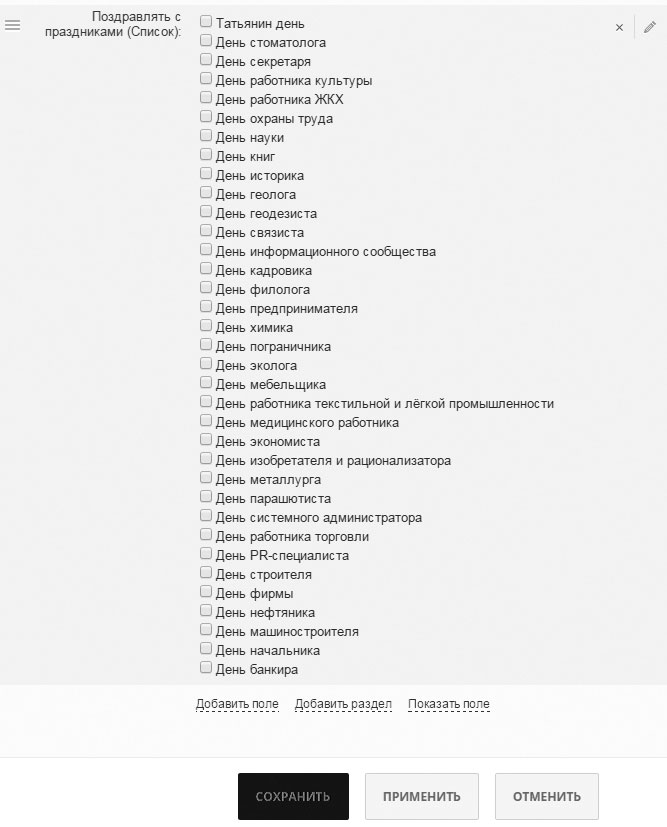 Составьте отдельный справочник профессиональных праздников, а в CRM запрограммируйте возможность присвоения людям конкретных праздников. Это нужно, чтобы формировались выборки – кого и с чем поздравлять. Вот такой модуль мы дописали в нашей CRM: