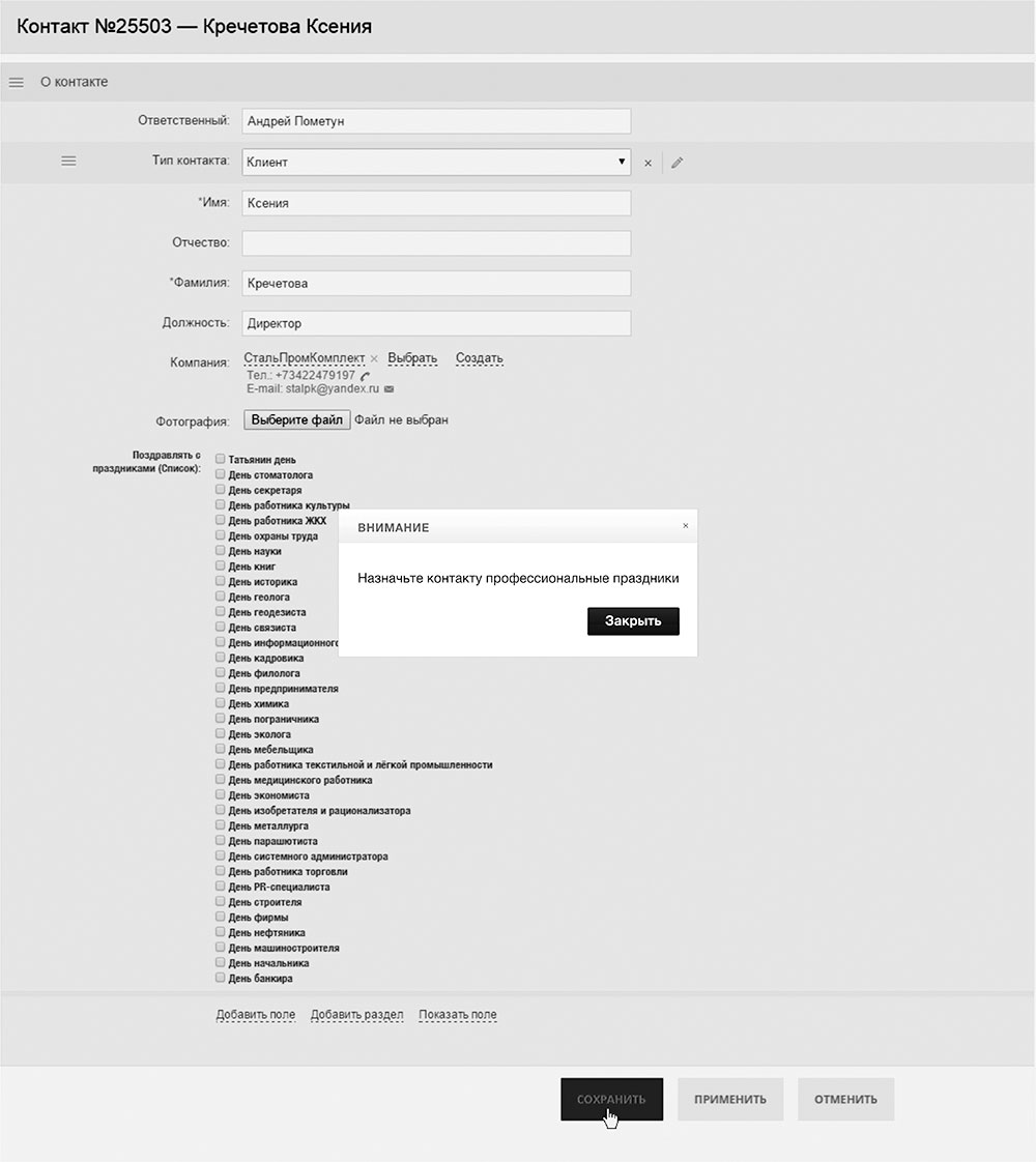 Чтобы не забывать присваивать новым контактам даты рассылок, нужно запрограммировать дополнительное напоминание. Как только вы создали новую запись в CRM, она выдает напоминание: «Назначьте новому контакту профессиональные праздники!»