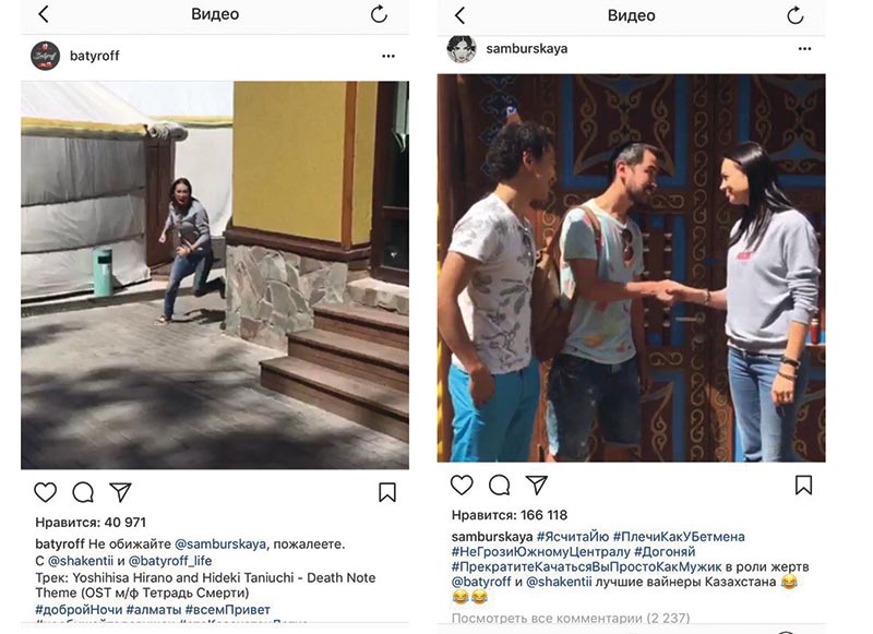 Еще это называется кросс-промо, оно бывает даже международного уровня. К примеру, мы прилетели с Настасьей в Казахстан, и пока у нее были съемки, запросили у казахов информацию о том, кто популярен в Instagram. Нам показали огромное количество аккаунтов. Больше всего нам понравился молодой человек по имени Нурлан Батыров @batyroff и его коллега по видео Шакенти @shakentii, они актеры. Недолго думая, я созвонился с ребятами, они были очень удивлены, что ими заинтересовались. В итоге решили встретиться и попробовать придумать какие-то ролики (сегодня это как раз и называется коллаборацией), максимально стараясь совместить Россию с Казахстаном. Настасья даже появилась в этом ролике в свитшоте с надписью «Россия», а снимали всё на фоне традиционных казахских шатров. Тогда Самбурская часто использовала образ Бэтмена. Один из комментаторов в ее профайле сказал, что у нее плечи, как у Бэтмена. Вместо того чтобы обижаться на подпис-чика, Настасья посмеялась и стала использовать тег #плечикакубэтмена. Вот что из этого получилось. Тогда нужно было вместить все в пятнадцать секунд, мы сделали два разных ролика и разместили по одному на каждом из профайлов.