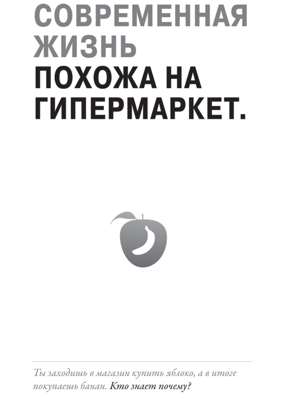 Большинство из нас не любят перемен. Почему? Потому что это означает, что мы должны сделать усилие и выйти из зоны комфорта. Часто перемены несут с собой неопределенность. И только некоторые видят в них возможности. Многие парализованы, дезориентированы или сбиты с толку отсутствием стабильности или слишком большим количеством возможностей. Сегодня жизнь похожа на гипермаркет, в котором на полках лежит более 70 тысяч товаров[1]. Ты заходишь в магазин купить яблоко, а в итоге покупаешь банан. Кто знает почему?