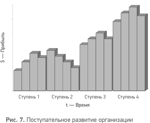 Итак, развитие организации происходит поступательно – от ступени к ступени – посредством чередования текущего и стратегического развития.
