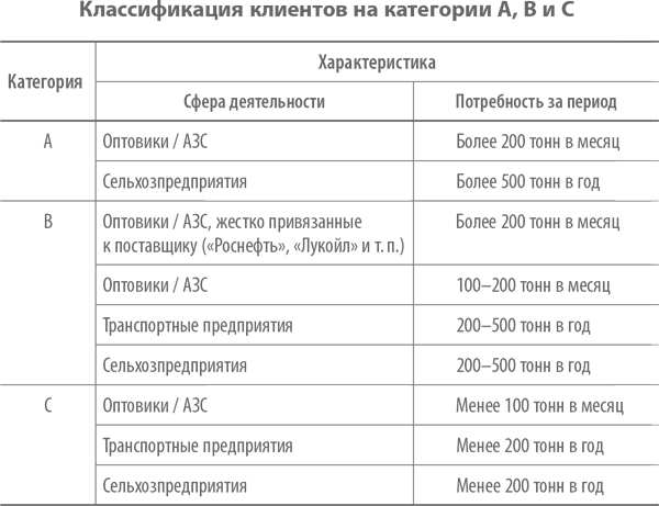 е) определение категории каждого потенциального клиента на основании информации, полученной в ходе телефонного разговора, согласно принятой в компании классификации (таблица «Классификация клиентов на категории А, В и С»);
