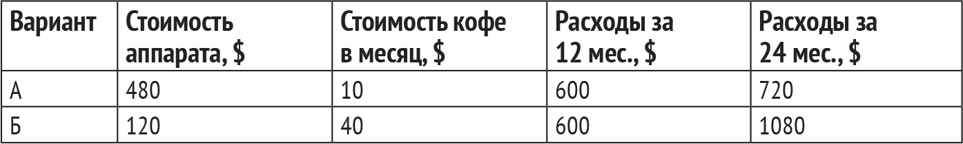 Человек рациональный выбрал бы любой вариант – через 12 месяцев цена за аппарат и кофе сравняется, но компании думали, что им выгоднее выбирать вариант Б, мы это часто наблюдали в самых разных отраслях.