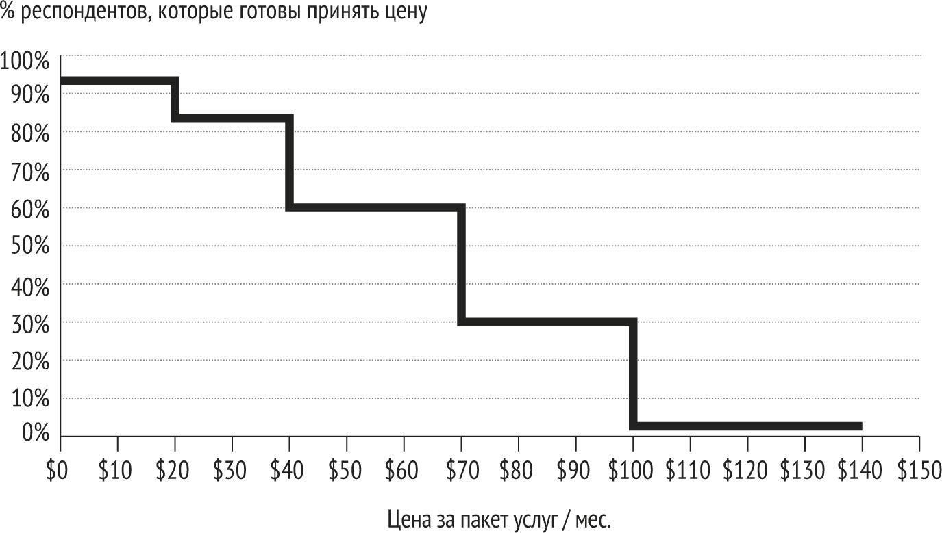 Вас, наверное, удивляет, почему в розничной торговле так редко встречаются такие цены, как $101; почти всегда попадаются $99 или $99,99. Причина в том, что у потребителей есть ценовые барьеры. Воспринимаемая разница между $99,99 и $101 составляет намного больше, чем доллар и пенни. Как правило, люди считают, что $101 намного дороже, чем $99. Исследование, которое мы провели для абонентской онлайн-компании, продемонстрировало этот феномен (рис. 26). Можно выделить четкие ценовые пороги – $40, $70 и $100. Этой компании было намного выгоднее выбрать цену $69,99, чем $71. Более 20 % ее клиентов не приняли бы $71. Это был ценовой барьер. Цена $69,99 уберегла компанию от потери значительной доли потребителей.