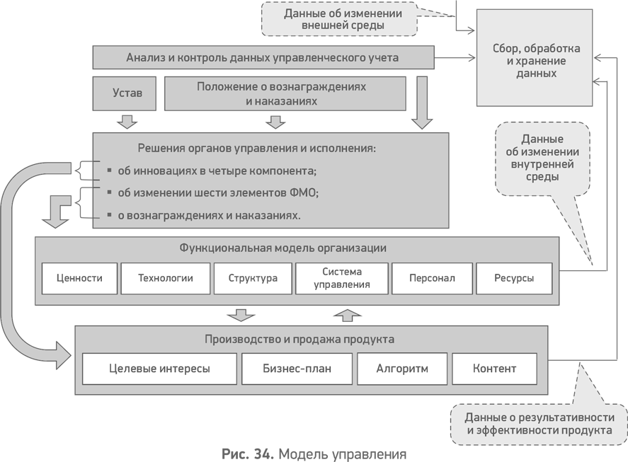 Чтобы понять, как взаимодействуют описанные выше четыре элемента системы управления (устав, органы управления и исполнения, положение о вознаграждениях и наказаниях, управленческий учет), а также какие виды управленческих решений возможны в организации, обратимся к пятому элементу системы – модели управления (рис. 34).