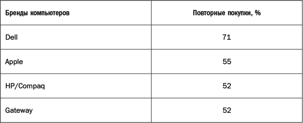 Учитывая все, что нам известно о законе двойной ответственности (см. главу 2), мы можем сказать: уровень повторных покупок у Apple несколько выше. То есть в следующий раз больше пользователей купят этот бренд, чем можно ожидать, исходя из доли рынка Apple. Есть более близкое к реальности объяснение лояльности бренду Apple: если пользователь перейдет на какой-нибудь другой компьютерный бренд, ему придется заменить операционную систему и, возможно, установить другое программное обеспечение. В противовес этому пользователи могут преспокойно переключиться с компьютера HP на Dell (и на множество других компьютерных брендов) и при этом пользоваться теми же операционной системой и софтом. Одного этого фактора вполне достаточно, чтобы объяснить чуть более высокий уровень лояльности по отношению к Apple, и это оставляет слишком мало места для страстной приверженности этому бренду. Не подумайте, будто у Apple и Harley-Davidson нет фанатов, просто они малочисленны и их не намного больше, чем страстных приверженцев конкурирующих брендов.