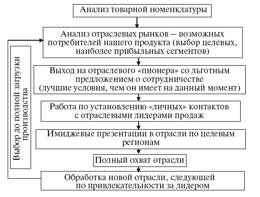 7. После того как отрасль практически полностью охвачена, по этому же алгоритму начинается проработка следующей, менее привлекательной, чем лидер, но все же имеющей свой потенциал отрасли. Оптимальной является подобная проработка до полной загрузки производственных мощностей предприятия.