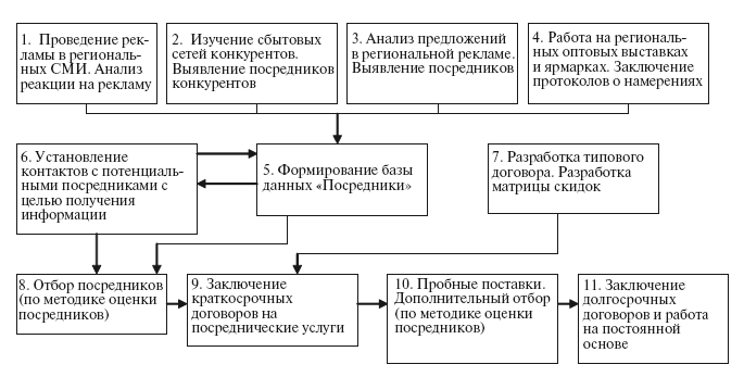 После того как принято решение о разработке посреднической сети, определены целевые регионы и ориентировочное количество посредников, можно приступать к работе по поиску посредников и созданию дилерских центров в регионах, пользуясь предложенной методикой (рис. 4.18).