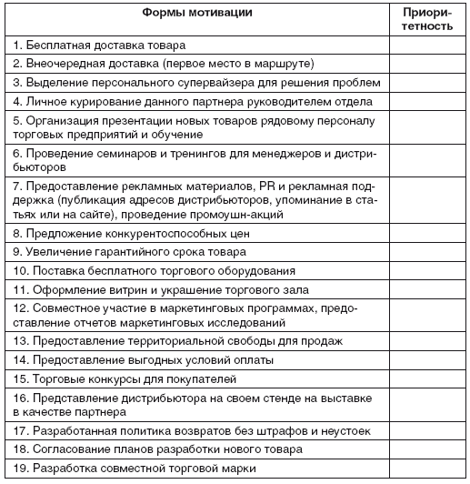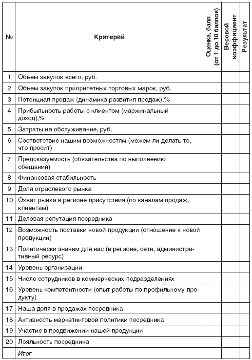 Для начала, целесообразно выделить наиболее и наименее перспективных торговых посредников, работающих в канале сбыта. Критерии, которые необходимо учитывать, выбирая и оценивая работу дилера, представлены в методике оценки торгового посредника.