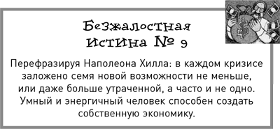 Подростком я читал одну книгу, которую потом потерял, и сейчас уже не помню ни автора, ни названия, но там было что-то вроде «Как нажиться на катастрофе». Прочитанное меня глубоко впечатлило. Впервые в жизни я услышал о «кризисном инвестировании» и о том, что крах соседа может стать твоим взлетом и что можно извлечь немалую выгоду из ситуации, которую все вокруг считают «кошмаром». Одна глава рассказывала о людях, разбогатевших в годы Великой депрессии 1929 года: кто скупал недвижимость, отели или компании, кто открывал новое дело в какой-то особой области. На уроках истории мне рассказывали, что Депрессия поразила всю Америку, и бедствовали все: помню фотографии босых людей в переселенческих лагерях, едящих консервированную фасоль из банок, картины упадка, разрухи и отчаяния. Но та книга рисовала совсем иной образ того же самого времени: инициативные и целеустремленные инвесторы и предприниматели, рьяно бросившиеся возделывать широкое поле новых возможностей. Все это пришлось очень кстати позже, когда Джимми Картер, избравшись в президенты, в одиночку устроил вторую Депрессию. (Многие читатели слишком молоды, чтобы помнить те времена, и не знают о чем речь. Вкратце: двузначные процентные ставки, двузначная инфляция, двузначный процент безработных и вдобавок километровые очереди на заправках). К тому времени я уже знал, что для сообразительного и деятельного человека экономика не бывает «хорошей» или «плохой» – он строит свою экономику сам.