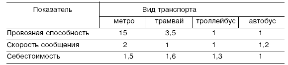 Для удобства сопоставления, если принять за единицу наихудшие показатели (наименьшую провозную способность, скорость сообщения, себестоимость), указанные показатели основных видов наземного городского пассажирского транспорта можно оценить в условных единицах.