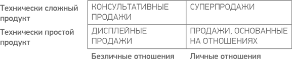 В результате использования осей координат «техническая сложность продукта – личные отношения» образуются четыре типа продаж.