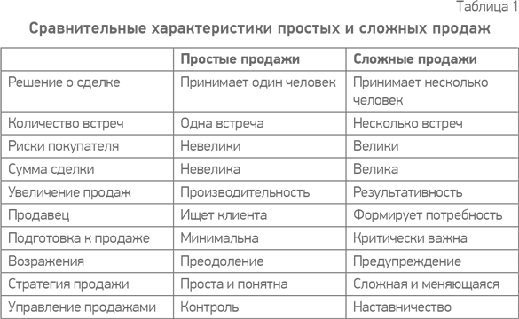 Основные отличия между простыми и сложными продажами показаны в таблице 1.