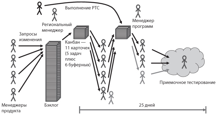 Драгош начал искать способы для дальнейших улучшений. Изучив данные о продуктивности тестировщиков его команды и сравнив их с показателями других команд XIT от того же подрядчика, он заподозрил, что тестировщики располагают существенными резервами. Между тем звено разработчиков можно было назвать настоящим узким местом. Драгош решил навестить команду в Индии и, возвратившись, посоветовал подрядчику перераспределить ресурсы. Число тестировщиков сократили с трех до двух, но добавили дополнительного разработчика (рис. 4.6). Это привело к практически линейному увеличению производительности: пропускная способность за квартал повысилась с 45 до 56.