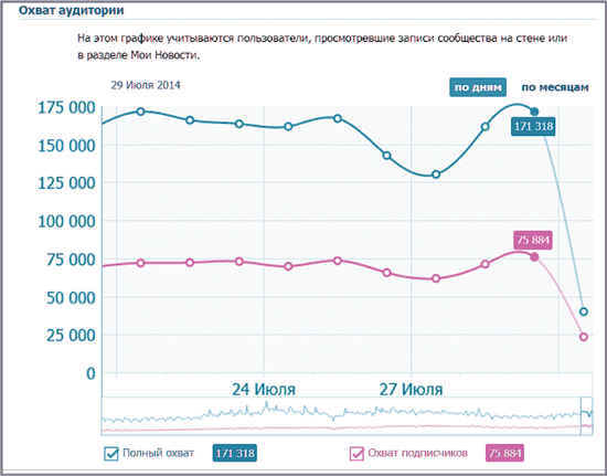 Охват «Литорга». Видим, что 29 июля 2014 года записи паблика видели 171 318 человек