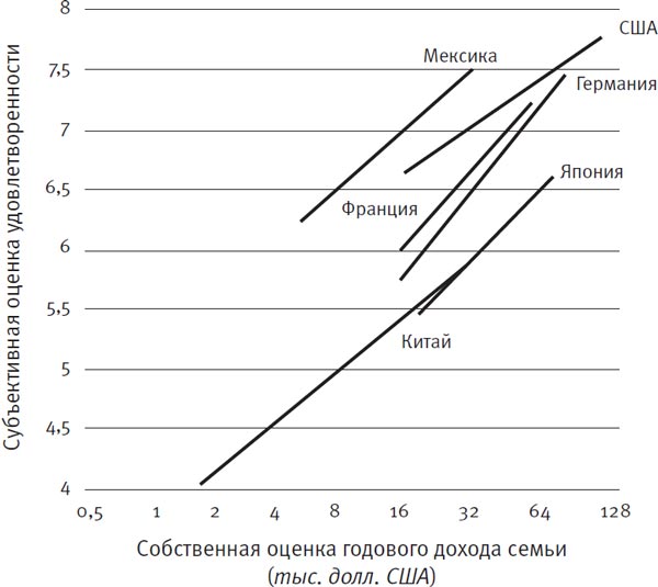 Интересно, что удвоение дохода всегда повышает вдвое субъективную оценку благополучия. Для человека, ежегодно зарабатывающего 1 тыс. долларов, увеличение дохода на тысячу дает такой же «прирост счастья», как прибавка в две тысячи для уже зарабатывающего 2 тыс. долларов, и т. д.