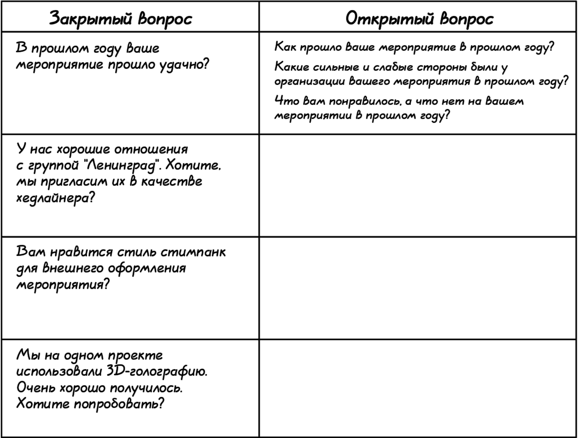 Но вовсе не обязательно каждый раз задавать именно их. Закрытые вопросы также полезны, особенно если нужно что-то уточнить, внести ясность в ранее обсуждавшийся вопрос, когда вы уже активно работаете над проектом. Открытые вопросы важны на стадии сбора информации, подготовки предложения, поиска подхода к клиенту.