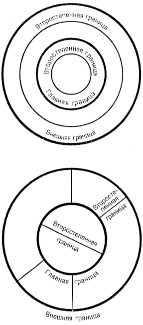 По этим двум причинам целесообразнее описывать значение структурной диаграммы не в географических терминах. Внешняя граница определяется как представляющая факторы, которые существенно отличают членов от нечленов, а главная внутренняя граница – как представляющая факторы, отличающие членство от лидерства. Эти определения подходят ко множеству самых разных ситуаций. В то же самое время они не мешают использовать при обсуждении и пространственные термины: это неизбежно, потому что повседневная речь изобилует пространственными словами.