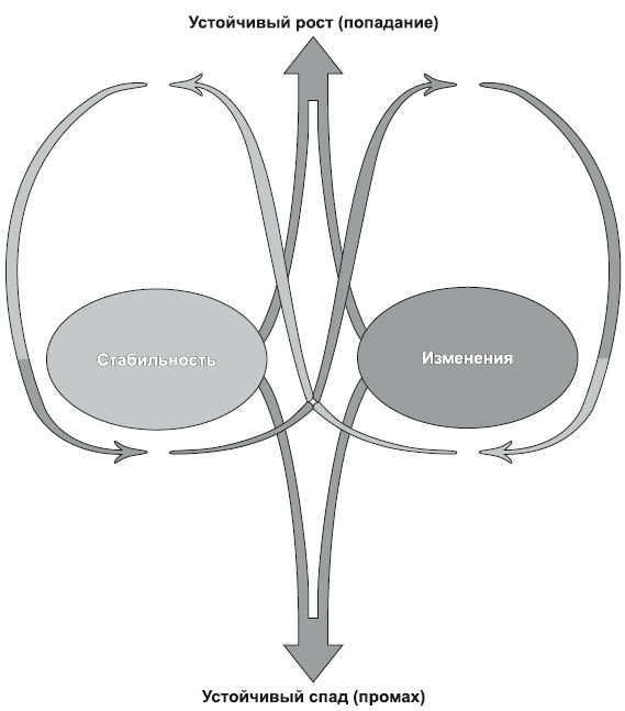 Если вы чрезмерно сосредоточитесь на одном полюсе пары в ущерб другому, вы получите изнаночную сторону первого полюса. Итак, если вы слишком сильно стремитесь к стабильности, вы столкнетесь с негативным эффектом действий, направленных на ее поддержание. Тогда у вас появится естественное желание перемен. Но чрезмерная увлеченность изменениями тоже приведет к негативным последствиям. Эта схема изображает негативный эффект чрезмерной сосредоточенности на изменениях (рис. 20).