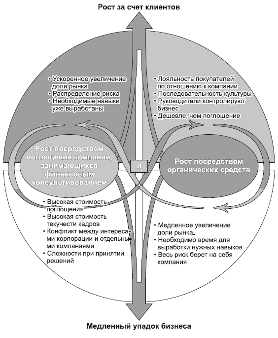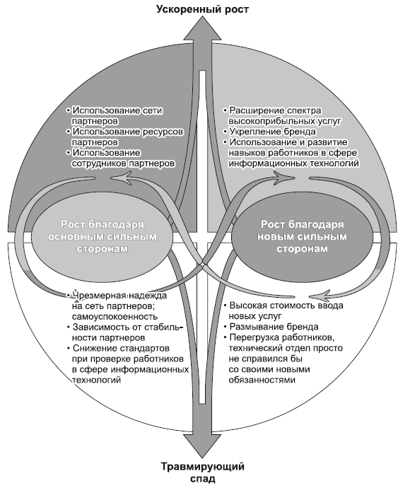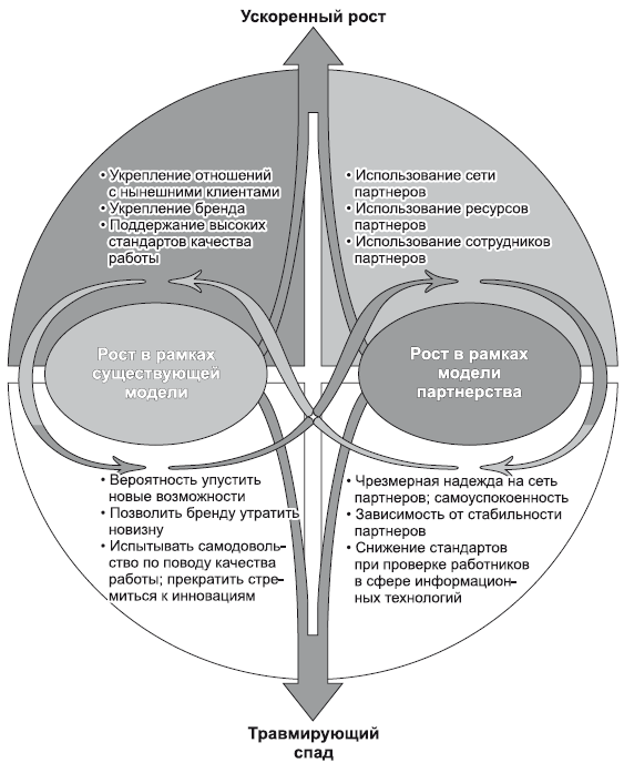 Рассматривая возможные исходы развития событий, эти две команды осознали следующее: цена провалившейся попытки расти за счет новых сильных сторон компании была бы огромной и намного превысила бы негативные последствия неправильного управления партнерством. Рост исключительно за счет новизны мог означать катастрофические потери капитала, размывание бренда и неспособность удовлетворять потребности клиентов в достаточном количестве высококвалифицированных сотрудников. И наоборот, рост за счет традиционно сильных сторон вызывал бы спад деятельности компании, хотя этот спад можно было бы ликвидировать за несколько месяцев и он не ставил под угрозу само существование компании (рис. 27).