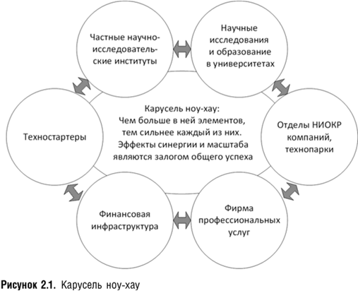 В дополнение к университетским структурам, ведущим научноисследовательскую и образовательную деятельность, карусель ноу-хау (см. рис. 2.1) включает в себя научно-исследовательские подразделения компаний, независимые (часто узкоспециализированные) научно-исследовательские институты, инфраструктуру для техностартеров, инвесторов и фирм профессиональных услуг (например, ведения бухгалтерского учета, юридической поддержки, управленческого и маркетингового консультирования, а также защиты интеллектуальной собственности). Чем больше элементов насчитывает такая карусель ноу-хау, чем более тесное сотрудничество возникает между ними, тем более устойчивым становится такой хаб в целом. Основу концепции карусели ноу-хау образует понимание того, что научные исследования мирового уровня возможны лишь при сильном взаимодействии между существующими и недавно созданными компаниями, а также с другими типами научно-исследовательских организаций: получить Нобелевскую премию сегодня невозможно без подобной кооперации. Конкурентное преимущество университета будет зависеть от того, насколько он сможет позиционировать себя как ядро хаба ноу-хау, как открытую сеть взаимодействия с другими исследователями, компаниями, государственными и негосударственными организациями. Подобная концепция резко контрастирует с «закрытыми обществами», которыми были средневековые и гумбольдтские университеты. Лёвенский католический университет позиционировал себя как место, «где необходимо быть» для развития передовых информационных технологий (как ИТ-оборудования, так и программного обеспечения), где присутствуют практически все крупнейшие ИТ-компании мира. Теперь этот университет планирует создать аналогичный хаб по биотехнологиям, который с выгодой для себя использует финансово-инвестиционную и профессиональную экспертизу, сосредоточенную в ИТ-хабе. Таким образом, к развитию хабов ноу-хау применимы законы эволюции: более сложные системы основываются на более эффективных механизмах передачи информации[97].