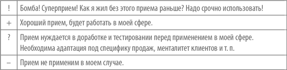 Рядом с названием каждого приема вы увидите пустой квадрат – . Ознакомившись с приемом, промаркируйте его одним из четырех знаков:! +? –. Благодаря этому, закончив читать книгу, вы сможете легко выделить наиболее актуальные приемы, создать собственный скрипт продажи[4] и быстро внедрить его в работу. Что означает каждый знак?