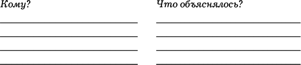 Запишите ниже, кому и что вы объясняли за последние месяцы. Это может быть ваш ребенок или ваша мама; вы могли объяснять что-то своему начальнику или подчиненному; рассказывать про регламенты работы организации своему клиенту или поставщику. Неважно кому. Главное, что вы что-то объясняли