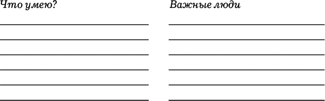 Составьте список своих способностей и навыков, а рядом – список людей, которые имеют для вас значение: родные и близкие, друзья, клиенты, авторитеты