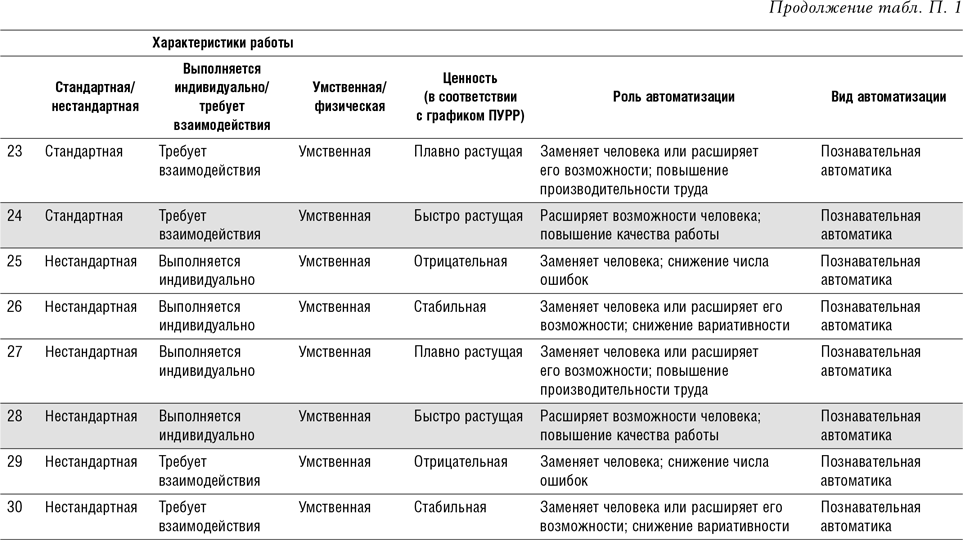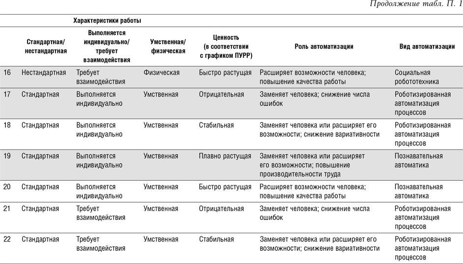 Табл. П.1 демонстрирует схему, которой следует руководствоваться при определении наиболее подходящего сочетания соотношения человеческих ресурсов и машинного труда (эту проблему мы более подробно уже разбирали в главе 4). Вы увидите, как отдельные характеристики и ценность работы связаны с ролью автоматизации и ее спецификой.