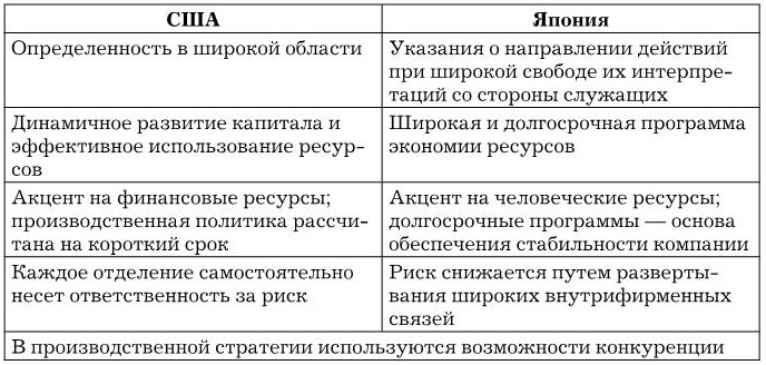 В сравнении стратегий американских и японских корпораций можно выделить два их типа: основанный на человеческих отношениях и стратегический тип. При этом два других типа стратегий – венчурный и бюрократический, который следует определенным устойчивым принципам, – существуют внутри этих типов.