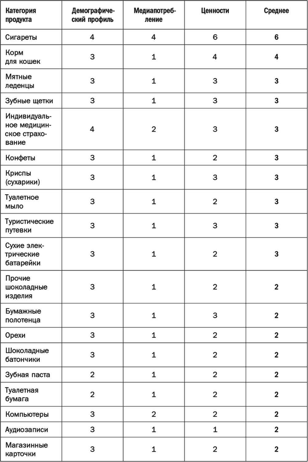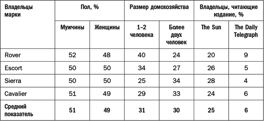 В табл. 5.1 приведены данные о владельцах машин уже за другое десятилетие (1990-е годы), но и здесь четко просматривается та же закономерность. Потребительские базы указанных британских автомобильных брендов очень схожи, даже в выборе прессы. Среди покупателей Rover, владельцев автомобилей элитной марки, насчитывалось больше поклонников бульварной прессы – таблоида The Sun, чем тех, кто читает газету значительно более высокого интеллектуального уровня – The Daily Telegraph. Это в полной мере относится и к владельцам автомобилей других брендов и говорит лишь о том, что The Sun пользуется гораздо большей популярностью, чем The Telegraph. Больше всего клиентские базы автомобильных брендов различаются по размеру домохозяйств. Просто более крупные домохозяйства покупают автомобильные марки более крупного размера (где больше мест и вместительнее багажник). Марки Sierra и Cavalier относятся как раз к такому разряду.