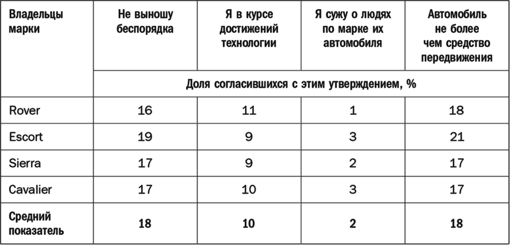 Сходство потребительских баз автомобильных брендов распространяется и на ценности, исповедуемые владельцами разных автомобильных марок. В табл. 5.2 содержится восхитительный набор ценностей, разделяемых потребителями. Видимо, 98 % респондентов покривили душой, утверждая, что не судят о ближнем по марке автомобиля, на которой этот ближний ездит. Но если так, то и честность, судя по всему, не зависит от марки автомобиля.
