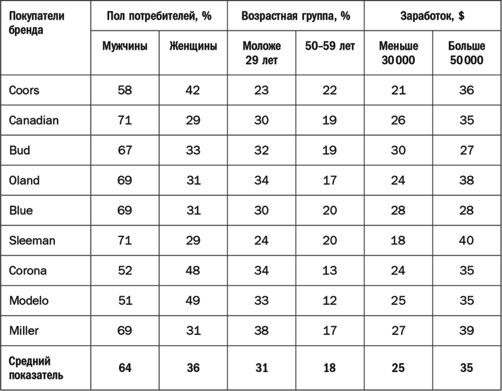 Теперь давайте рассмотрим положение с пивными брендами в Канаде (табл. 5.3) Несмотря на различия брендов в цене, происхождении (от Мехико до Торонто) и имидже, профили клиентов у них практически одинаковы. У брендов Modelo и Corona потребительские базы незначительно смещены в сторону женщин и более молодых любителей пива, но это, пожалуй, единственное сколько-нибудь существенное различие.