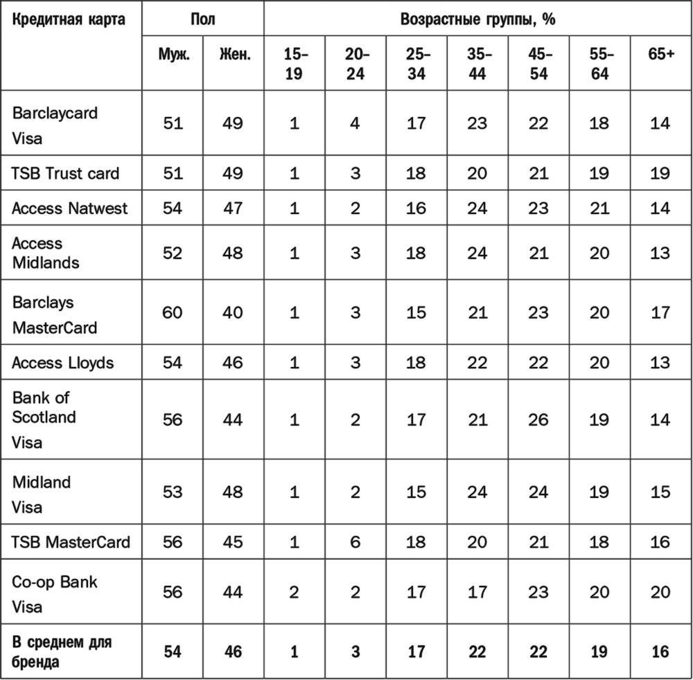 Таблица 5.4. Демографические профили различных брендов кредитных карт, Великобритания
