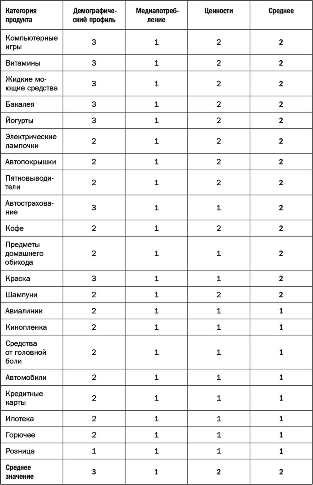 Такого рода мелкие различия – а некоторые из них обусловлены всего лишь случайными колебаниями в выборках – имели место в результатах всех научных исследований. Это показывает табл. 5.5, где отражены средние величины средних отклонений от нормы для бренда для более чем 40 категорий товаров/услуг.