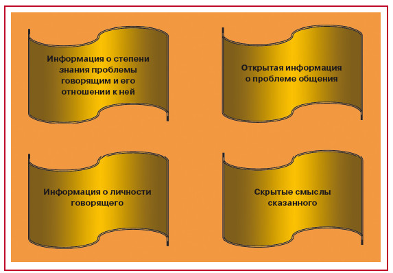 Скрытая, глубинная информация о личности говорящего. Помимо относительно доступной информации о личности говорящего в процессе общения нередко можно получить глубинные, более объективные сведения о том, чего он действительно добивается и что из себя на самом деле представляет.