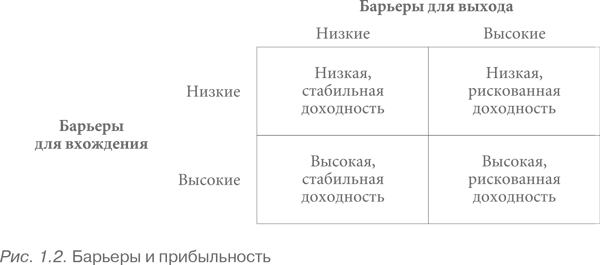 Наилучшим вариантом с точки зрения отраслевой прибыли является сочетание высокого уровня барьеров для вхождения и низкого уровня барьеров для выхода. В этом случае появление новых конкурентов будет затруднено, а проигравшие конкуренты покинут отрасль. Если оба барьера высоки, потенциал прибыльности значителен, но, как правило, сопровождается повышенным риском. Хотя вхождение блокировано, неудачливые фирмы останутся в отрасли и будут продолжать бороться.