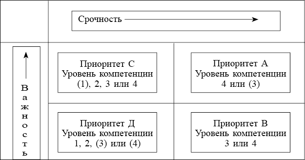 Рис. 9, приведенный выше, демонстрирует, каким образом изложенные принципы делегирования транслируются в модель расстановки компетенции. Уровни компетенции в скобках указывают на возможности, но не на идеалы. Я бы подчеркнул тем не менее, что корреляция между уровнями компетенции и матрицей приоритетов не всегда соответствует практике, но, несмотря на это, представляет собой полезное руководство, помогающее эффективно распределить работы внутри команды.