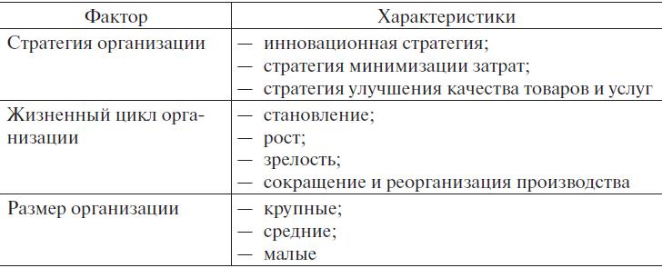 Выбор стратегии управления человеческими ресурсами должен осуществляться с учетом таких факторов, как жизненный цикл организации, стратегия ее развития, размер организации, а также с учетом характеристик внешней среды. Основные факторы, определяющие стратегию управления человеческими ресурсами, представлены в табл. 4.1.