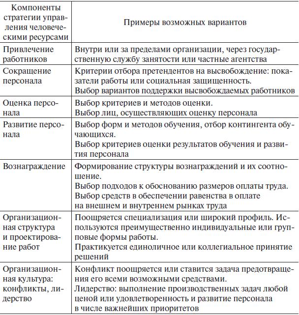 Таблица 4.3. Основные составляющие стратегии управления человеческими ресурсами и их возможные варианты[13]