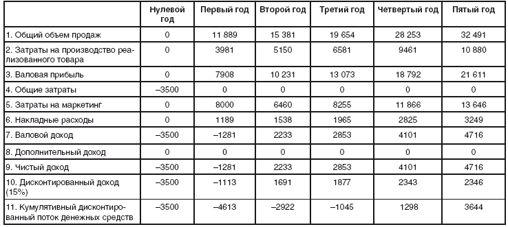 В строке 4 показаны ожидаемые общие затраты на выведение на рынок нового товара в размере 3,5 млн долл., включающие в себя затраты на разработку товара, маркетинг и организацию производства.