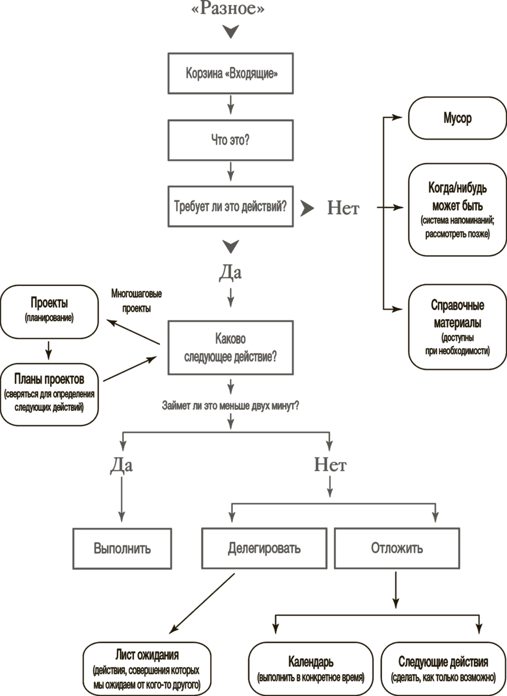 Информация, не требующая никаких действий, попадает в одну из трех категорий: «выбросить», «обдумать», «сохранить для справки». Следовательно, вы избавляетесь от нее; откладываете, чтобы позже еще раз к ней вернуться; или храните, чтобы обратиться к ней в случае необходимости. Для того чтобы справиться с задачами, требующими дальнейших действий, потребуются список проектов, система хранения вспомогательной информации по проекту, календарь, список напоминаний о следующих действиях, а также лист ожидания.