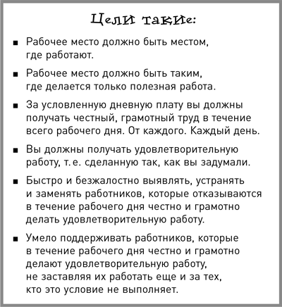 Наконец, четвертый способ, для нашего времени довольно радикальный, – самому все время быть на месте и всем управлять. Многие предприниматели куда охотнее проводят время на лужайке для гольфа, на пляже, дома с детьми, в Starbucks – да где угодно, лишь бы не в собственной фирме, и за каким угодно занятием, лишь бы не за улаживанием собственных дел. Что ж я всей душой за то, чтобы понежиться на солнышке, и всем советую строить бизнес так, чтобы он был вашим слугой, а не хозяином. И я убеждаю бизнесменов время от времени устраняться от текучки, чтобы заняться другой, важнейшей работой – придумыванием рекламы, составлением маркетингового плана и пр. – в более стимулирующей и спокойной обстановке, где ничто не будет отвлекать. Но. Есть очень большое НО. Я буду повторять снова, и снова, и снова: если вы все-таки решили нанимать людей, извольте принять на себя соответствующие обязанности. Увлекать, руководить и НАДЗИРАТЬ. Кроме того, знать, что на самом деле происходит на твоем предприятии, невозможно, если бываешь там редко или не бываешь вовсе. Никто не сможет обойтись без «управления методом личного вмешательства», как это называет Том Питерс[29]. Ходите и слушайте. Вмешивайтесь и действуйте. Видьте всех, и пусть видят вас.