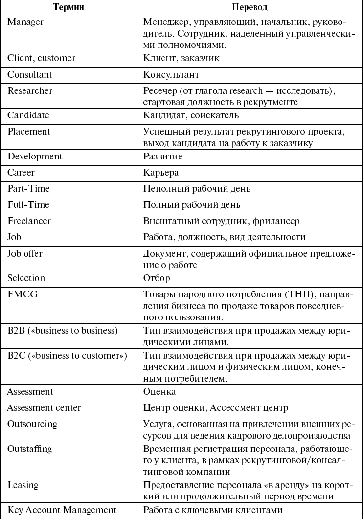 Для того чтобы все стороны, участвующие в процессе поиска и подбора персонала, понимали о чем речь, был разработан словарь профессионального рекрутера. Эти слова по большей части пришли из английского языка, и для меня, как для человека, не владеющего им, бывают трудно произносимы. Поэтому предложенный моими коллегами словарь терминов был очень полезен.