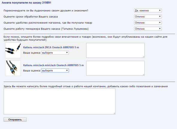 Мы решили отказаться от телефонных опросов. Сотрудники «Аудиомании» в один голос заявили, что такие звонки приходят обязательно в неудобное время – во время прогулки с детьми, во время похода в кино, во время приёма ванны и т. д. Поэтому мы решили, что опрашивать будем только по e-mail. На электронную почту клиенту посылается уникальная ссылка, которая и ведёт на наш опросник.